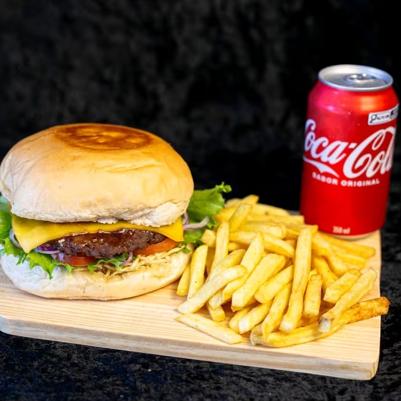 Pão de hambúrguer, molho verde batata palha, hambúrguer artesanal, barbecue , alface , tomate cebola roxa (crua) + Batata frita simples + 1 coca Original 350ml .