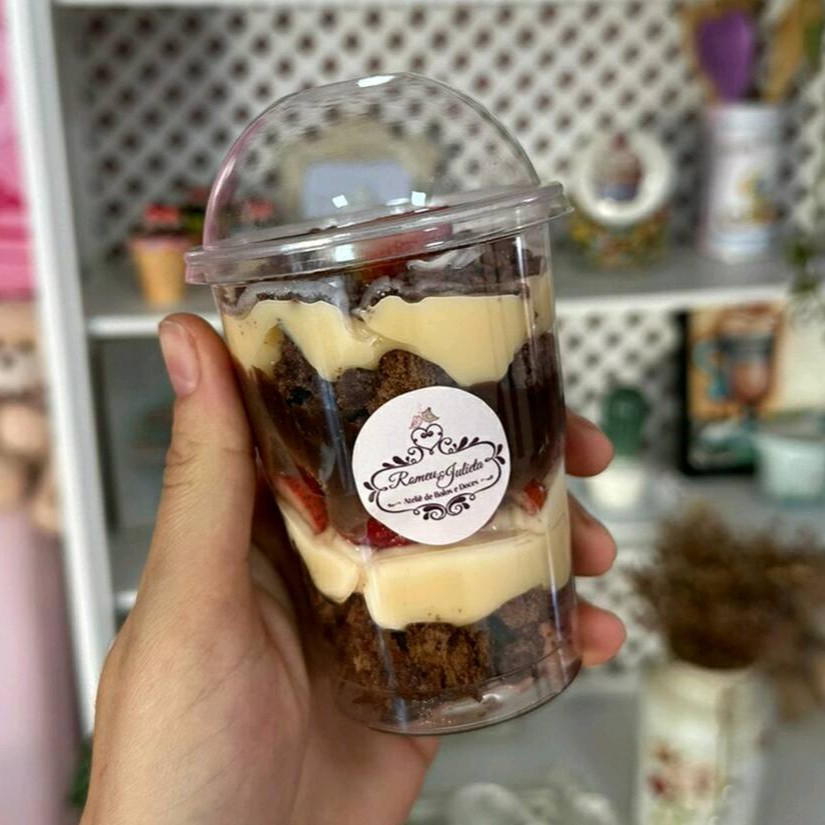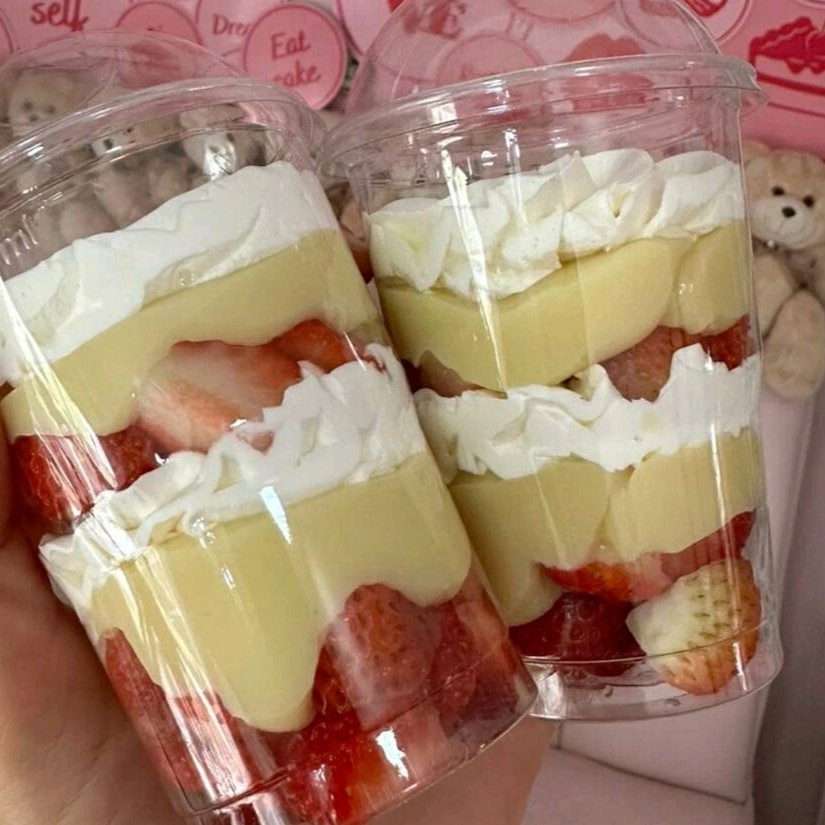 Camadas intercaladas de morango, brigadeiro branco, chantilly e finalizado com suspiro