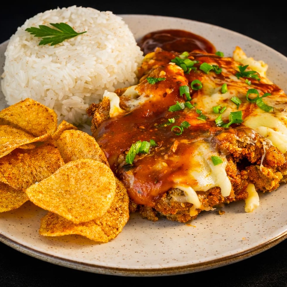 Frango à parmegiana com molho de tomate e Muito quejo, acompanha Arroz, feijao, Batata frita e salada de alaface com tomate e cenoura (mandado separatamente)