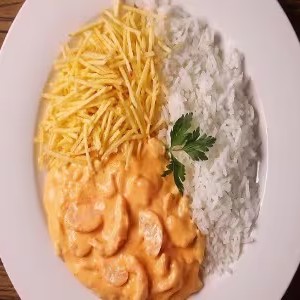 Cubos de frango macios ao molho cremoso de strogonoff, preparados com tempero caseiro e acompanhados de arroz e batata palha.