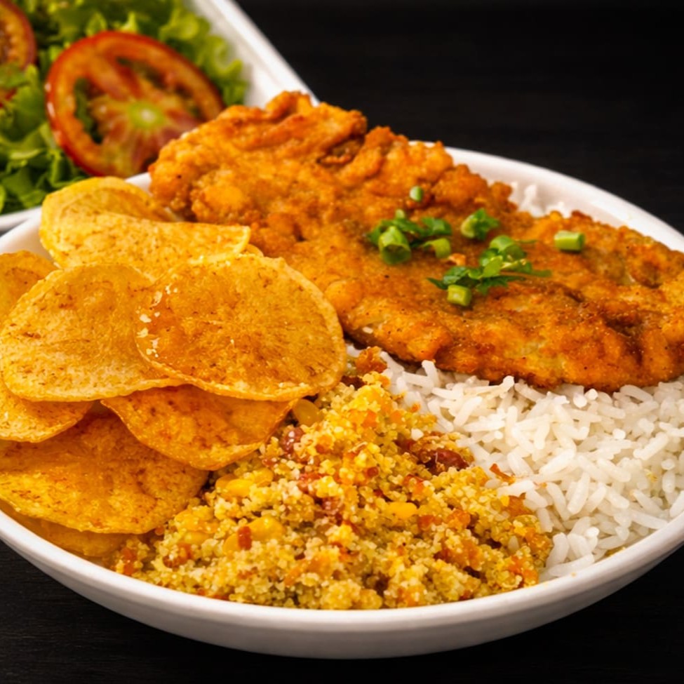 Filé de Frango A Milanesa acompanha arroz,feijao,farofa,batata frita e salada de alface com tomate(mandado separatamente)