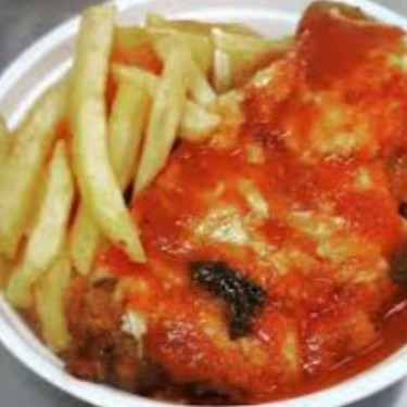 FEIJÃO, ARROZ, BATATA FRITA, FRANGO A PARMEGIANA