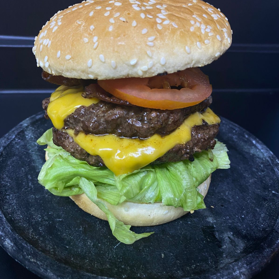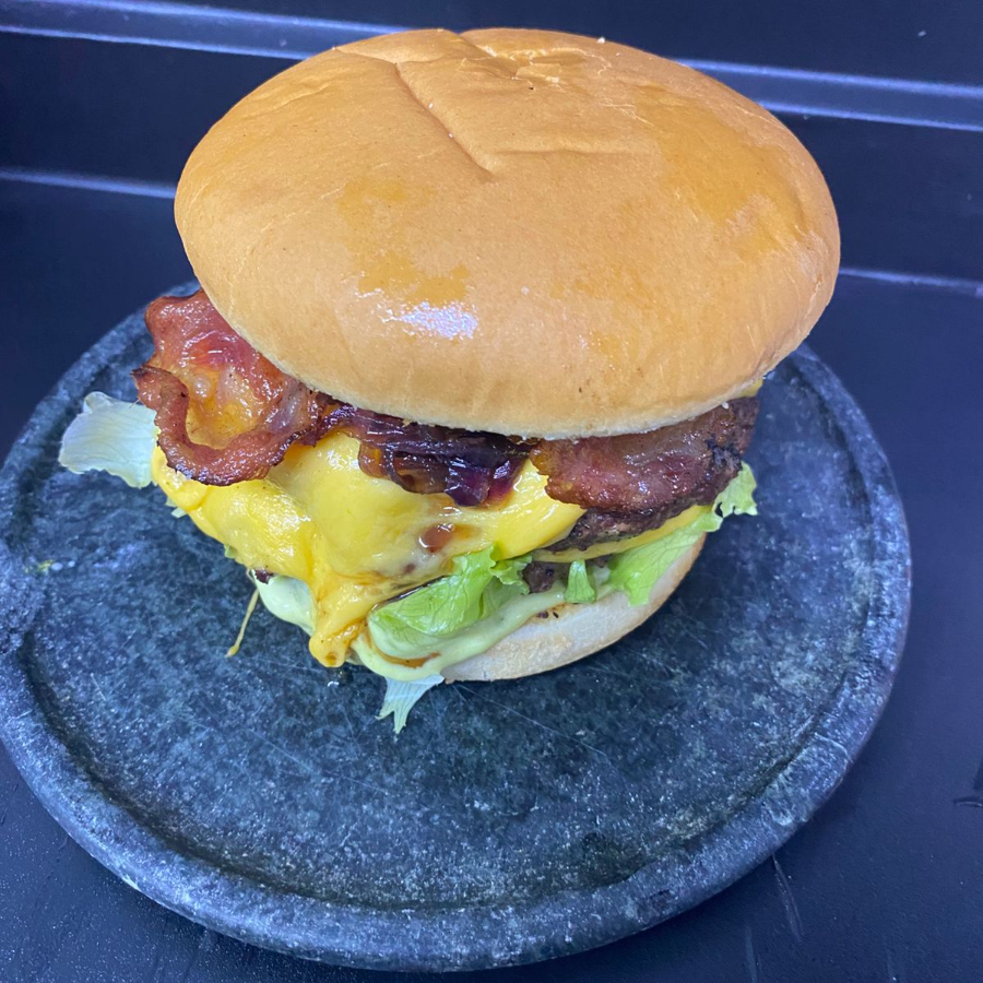 2 hambúrgueres artesanal de 150 gr cada, pão com gergelim, bacon crocante, queijo cheddar, saladinha da casa, barbecue e maionese sailor.
