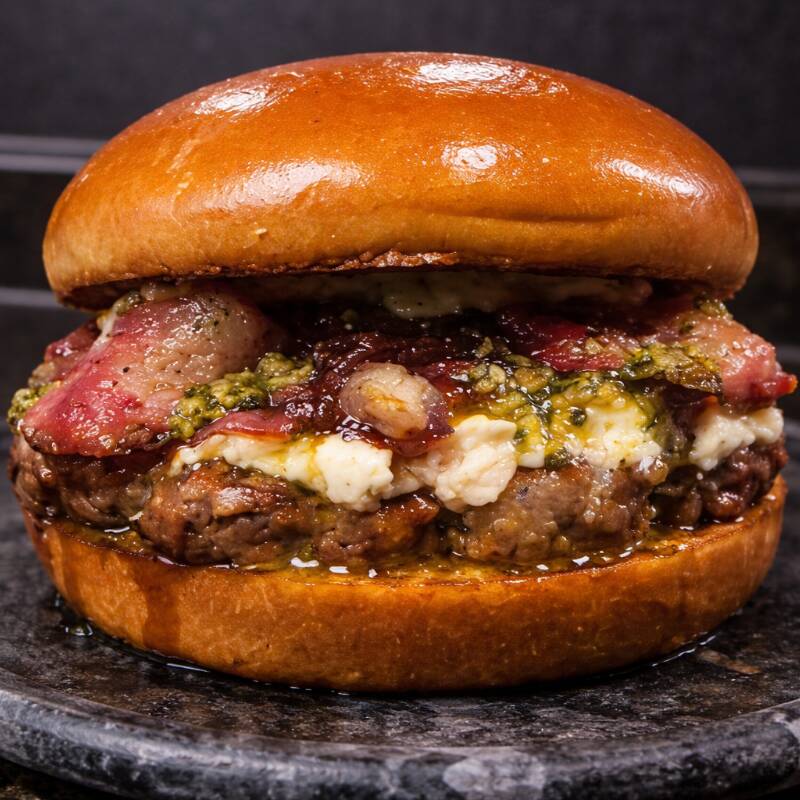 Hambúrguer artesanal de 150 gr com blue cheese cremoso, pão brioche, cebola caramelizada, molho pesto, bacon crocante e maionese sailor. (Observação: no molho pesto contém nozes)