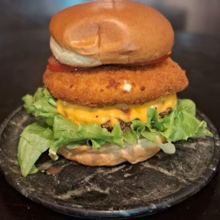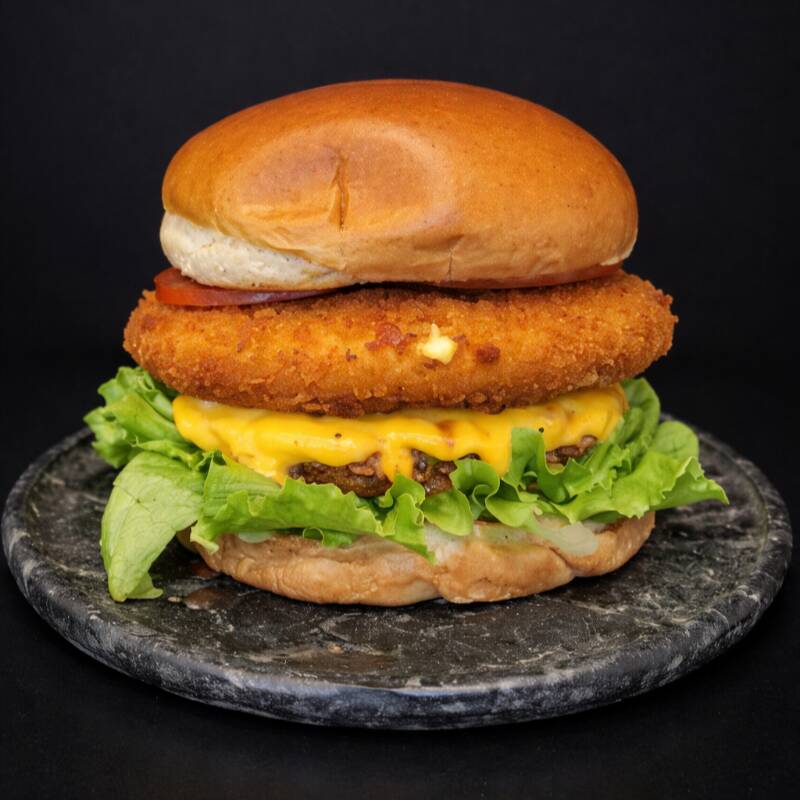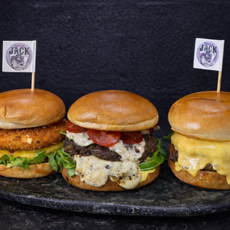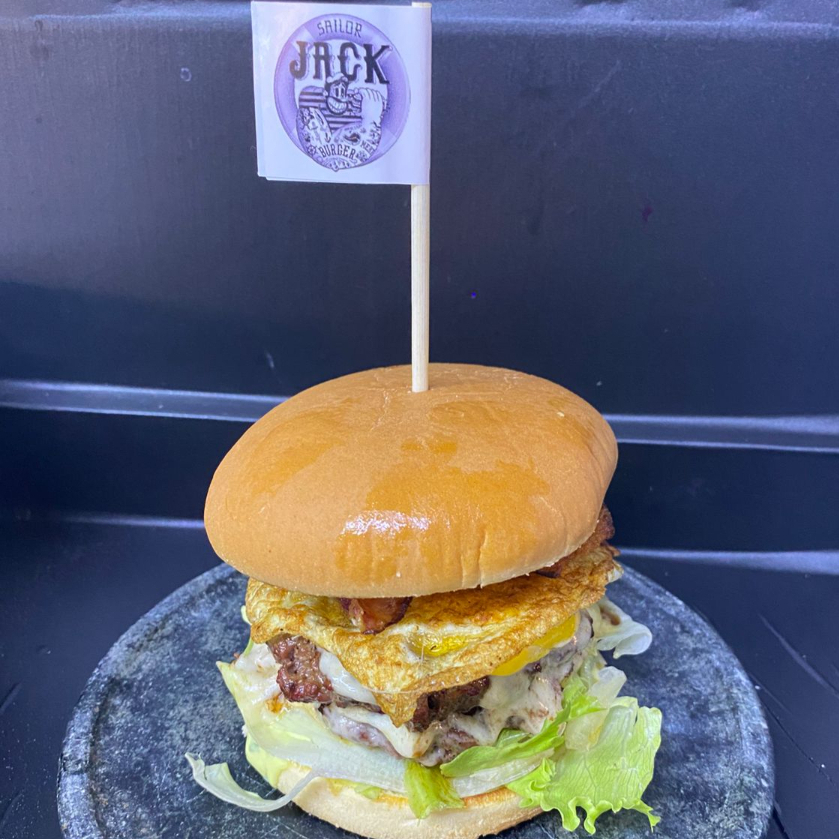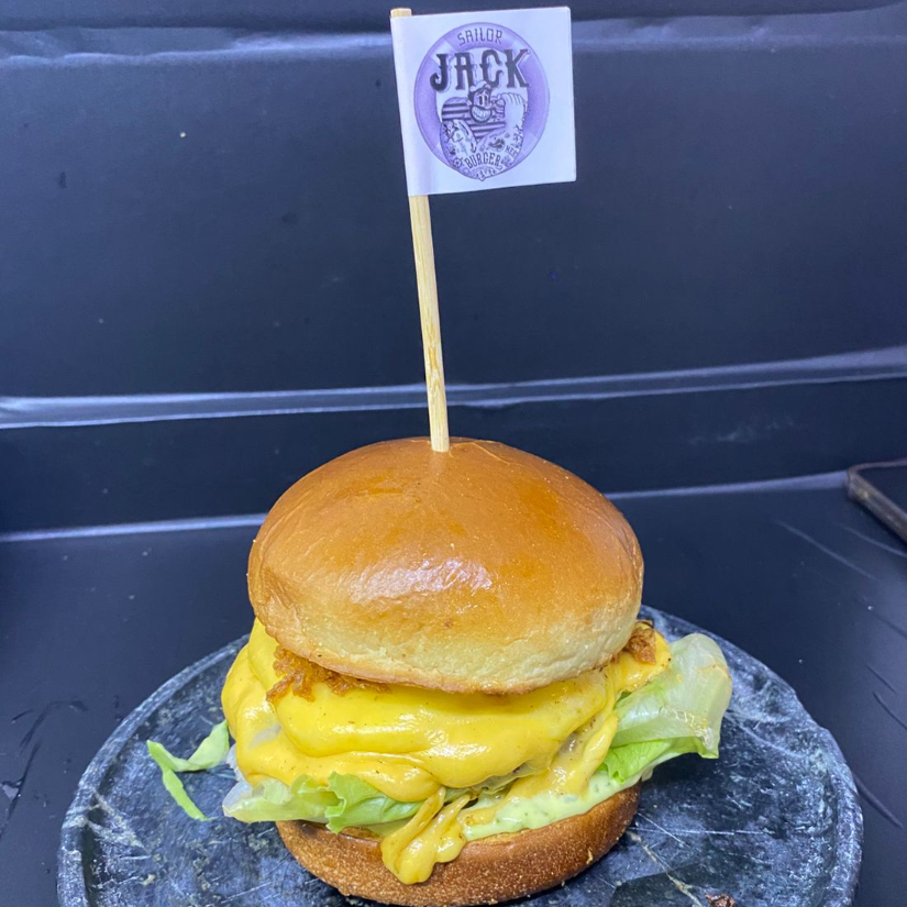 Pão jack tradicional, hambúrguer artesanal de 170 gr, queijo prato derretido, provolone e mussarela empanado, saladinha da casa e maionese Sailor.
