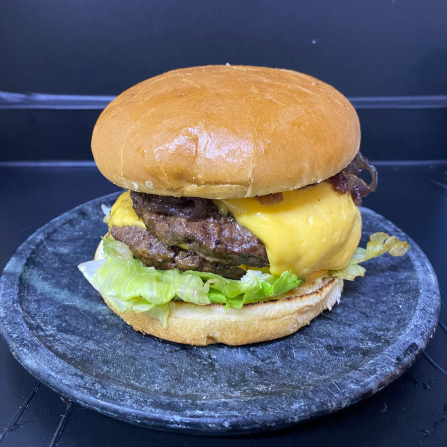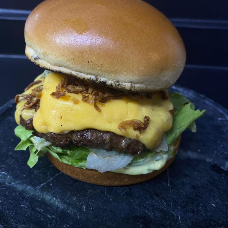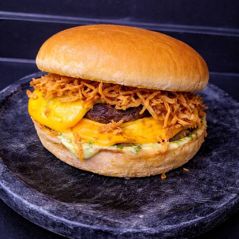 2 smash burger 90g, pão tradicional, queijo prato, cheddar americano, cebola crispy e maionese verde da casa.