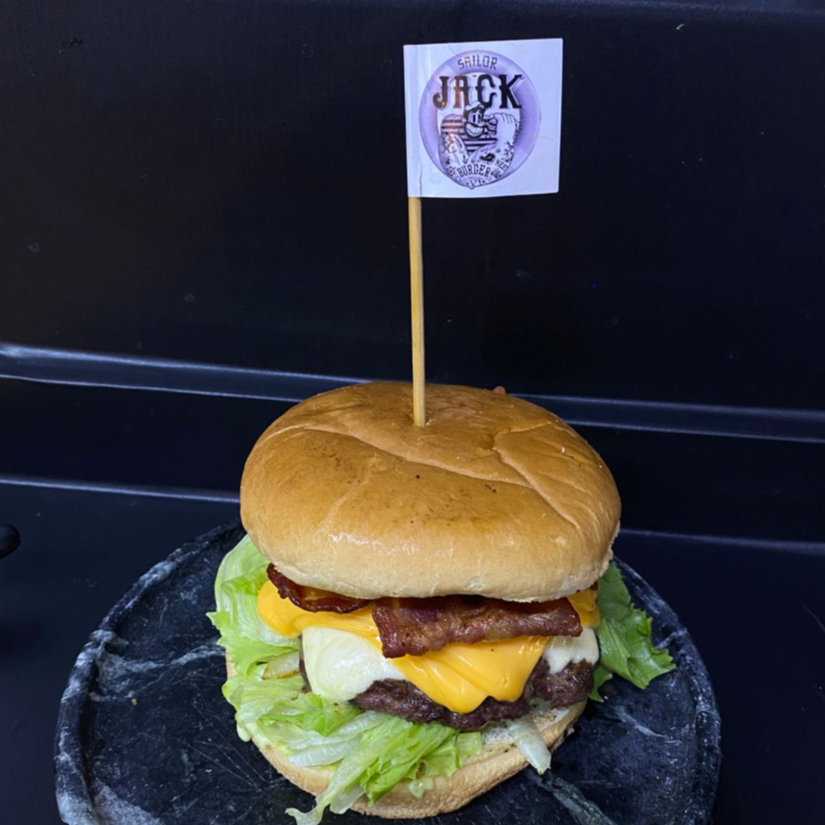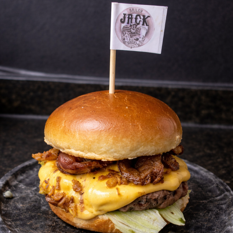 Hambúrguer artesanal de 150 gr, pão Jack Gergelim, bacon crocante, queijo cheddar derretido, salada da casa e maionese Sailor.