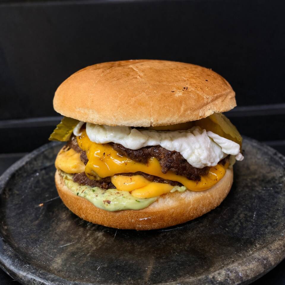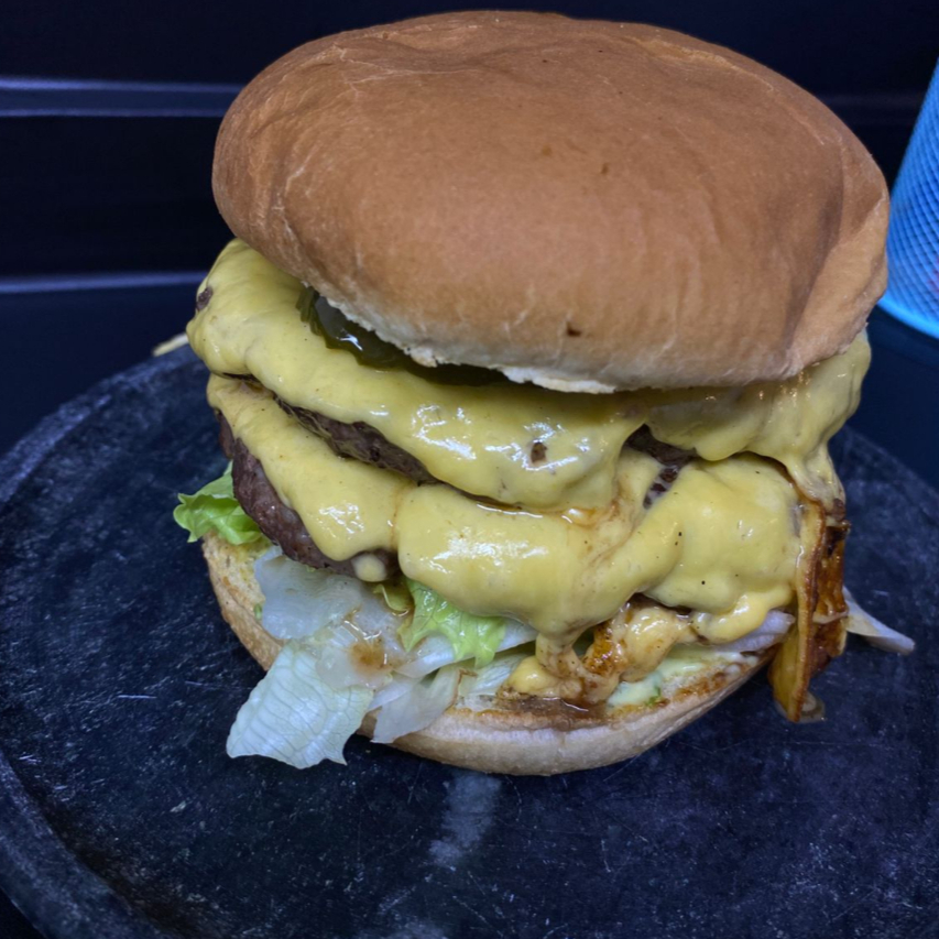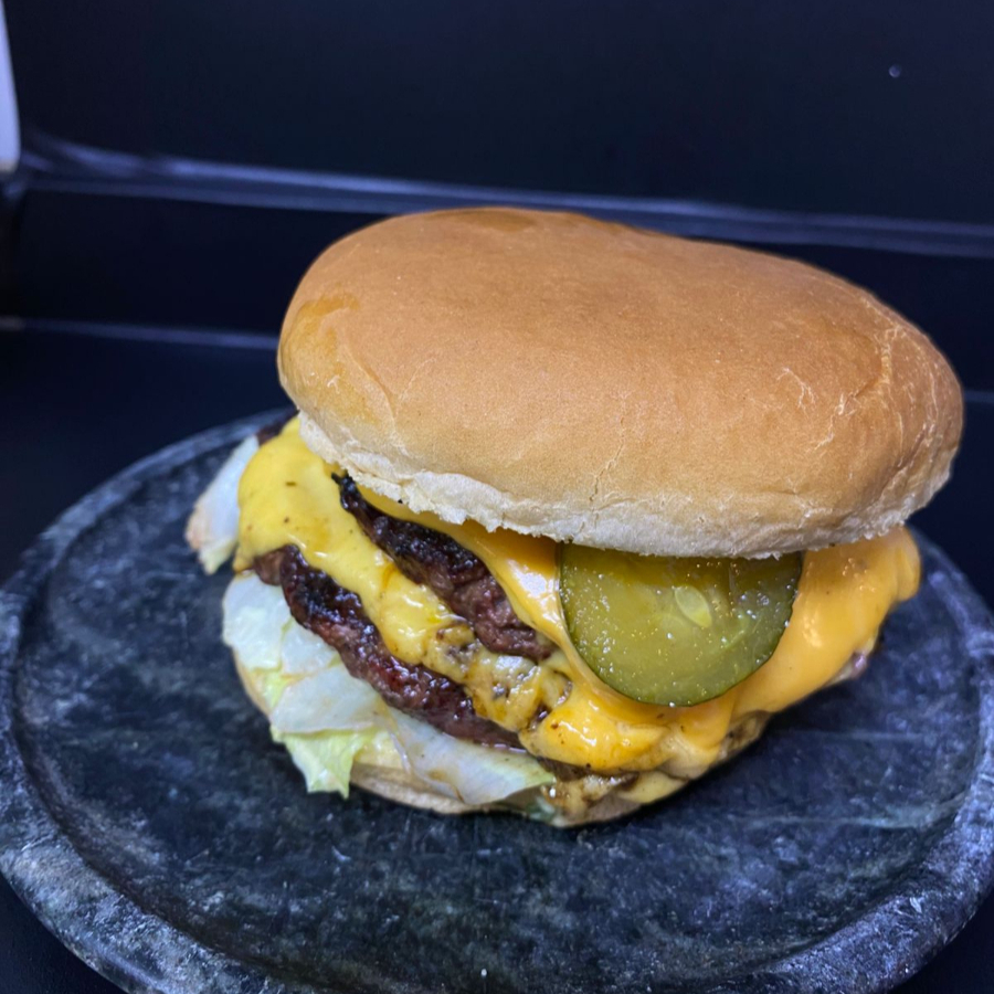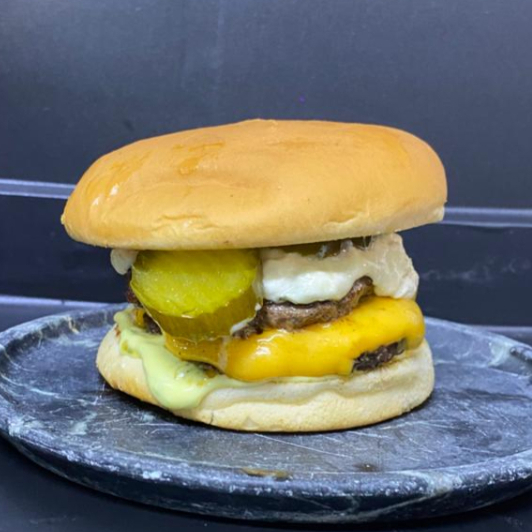 2 smash burguer de 90 gr, pão tradicional, queijo prato, cheddar americano, molho barbecue e maionese verde da casa.