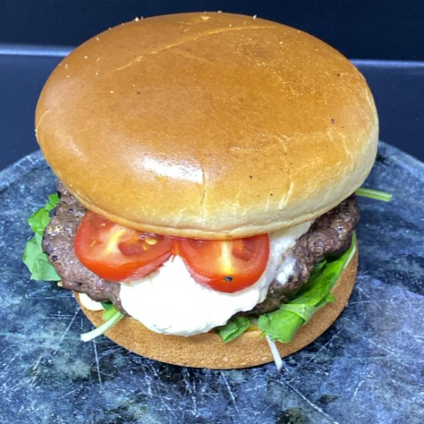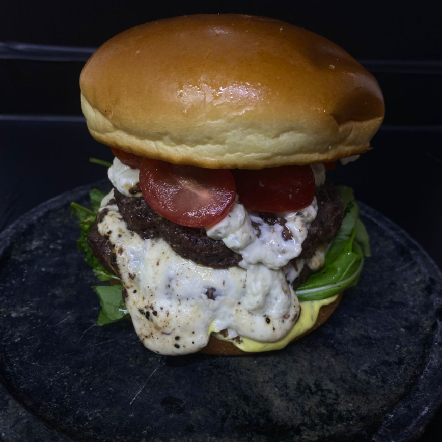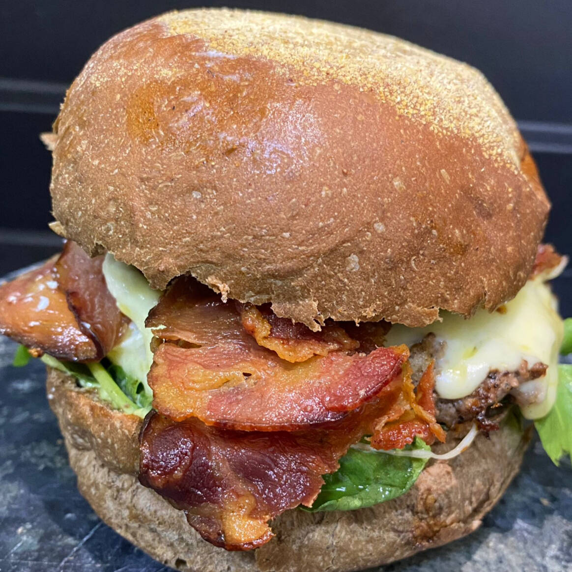 Delicioso pão Australiano de fermentação natural, hambúrguer de 150 gr, blue cheese, mussarela, rúcula, bacon e maionese sailor.