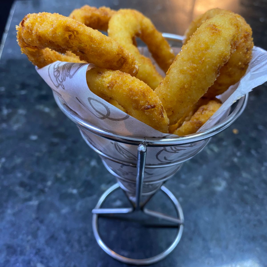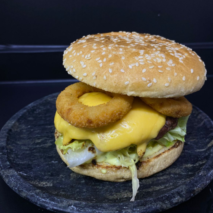 Hambúrguer artesanal de 150gr, pão brioche, queijo prato, anéis de cebola empanado, saladinha da casa e maionese Sailor.