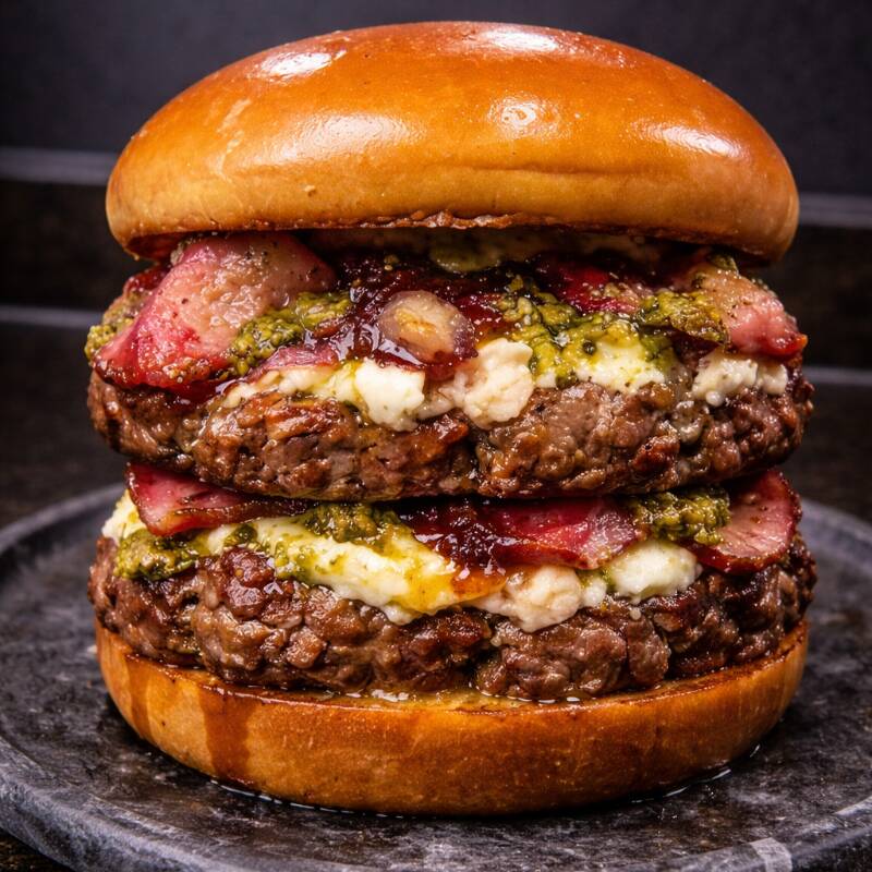 2 hambúrgueres artesanais de 150 gr, pão brioche, queijo prato, burrata do cheff, cebola crispy, alface americana, molho Pesto fresco, bacon crocante e maionese Sailor. (Obs: Alérgicos contém nozes no molho)