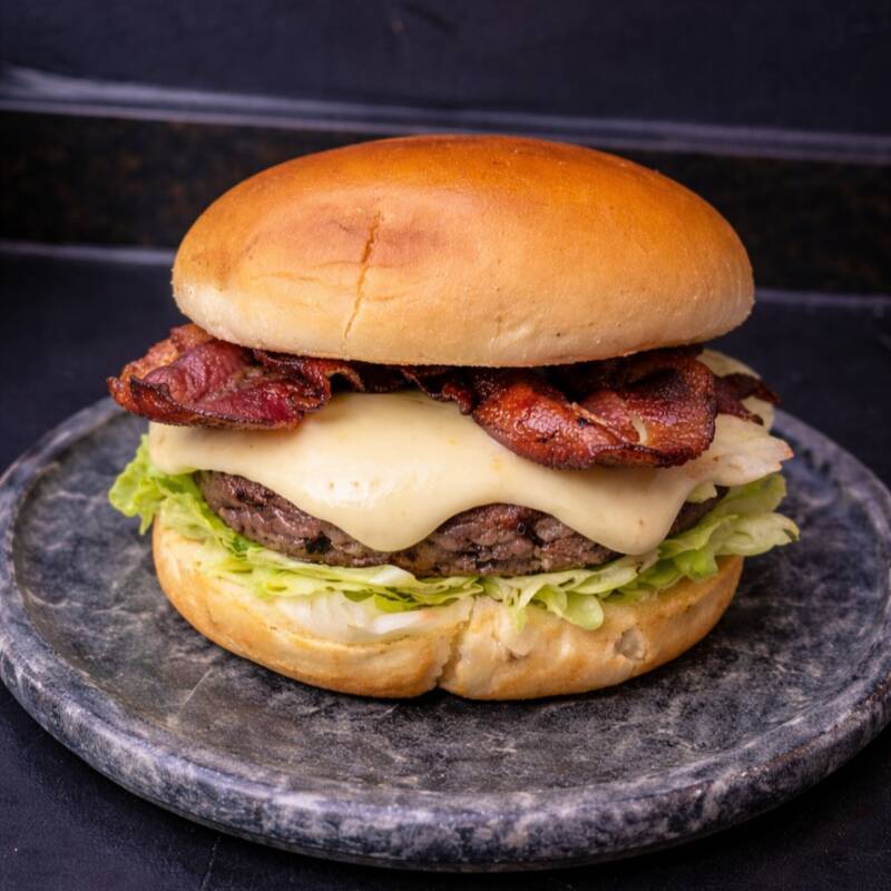 Hambúrguer artesanal de 100gr, pão de hambúrguer raiz, mussarela, bacon crocante, burrata do chef, saladinha da casa e maionese Sailor.