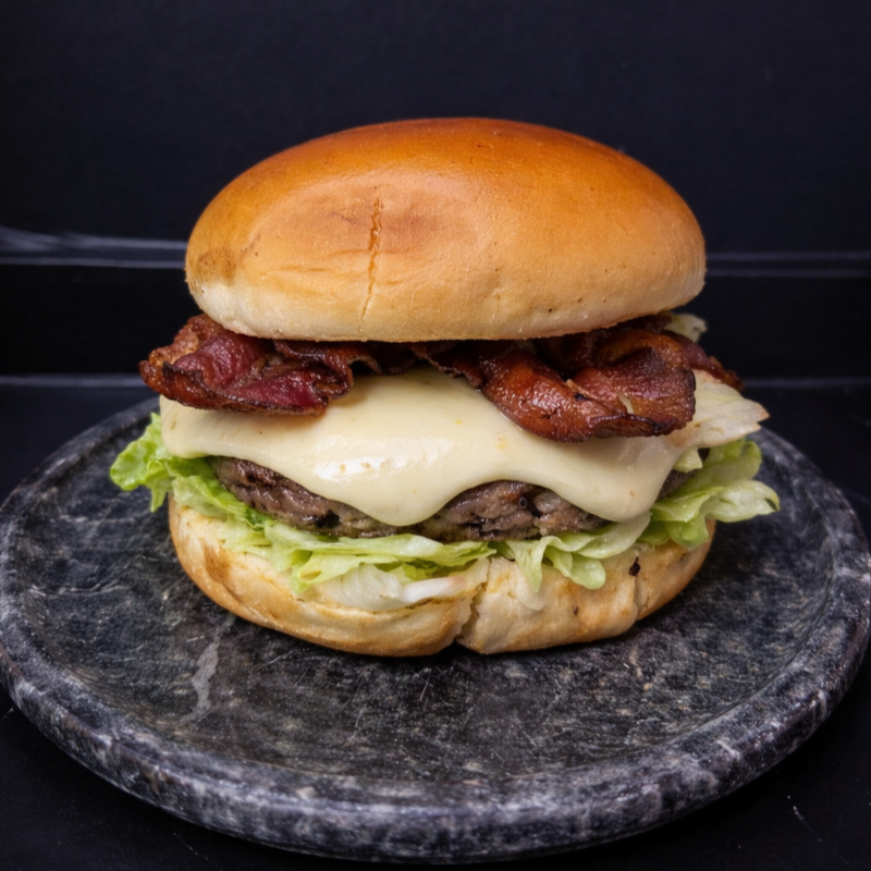 Hambúrguer artesanal de 100g, Pão de Hamburguer Raiz, mussarela, bacon crocante, Picles, saladinha da casa e maionese Sailor.