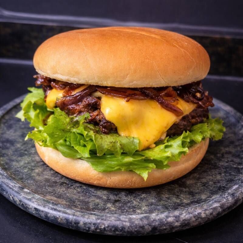 Hambúrguer artesanal de 150 gr cada, pão tradicional, queijo prato, cebola roxa caramelizada, bacon, barbecue, alface americana e maionese sailor.
