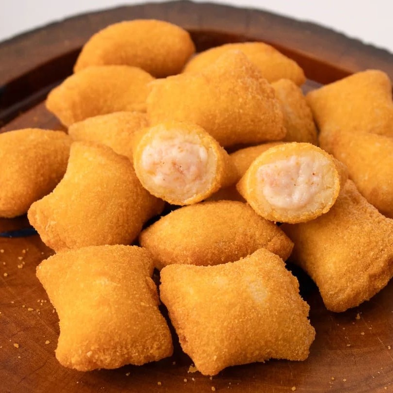 Recheio cremoso de queijo derretido em uma casquinha crocante.