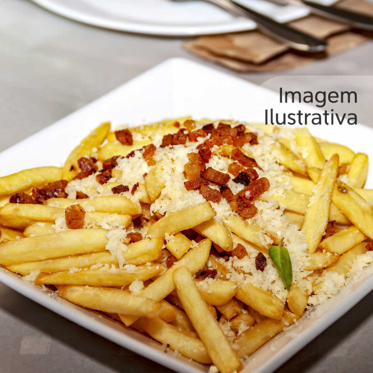 Deliciosa e crocante porção com 400g de Fritas com Queijo e Bacon
