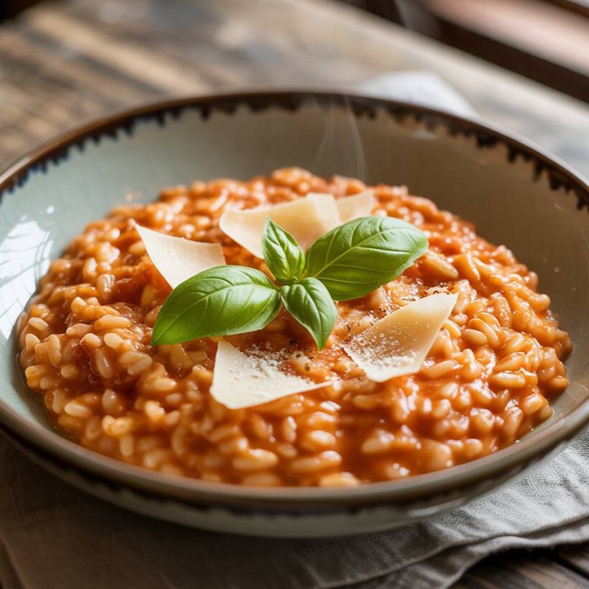 Arroz arbóreo cremoso com tomates assados lentamente e manjericão fresco, um prato leve e aromático.