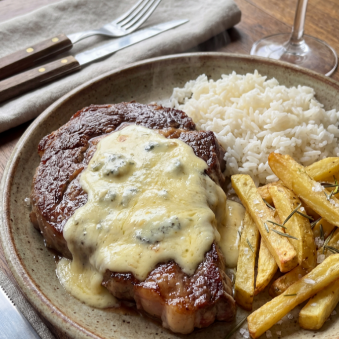 Corte grosso e ultra suculento de , grelhado e finalizado com molho cremoso de 4 queijos. Aconhado de Arroz e Fritas