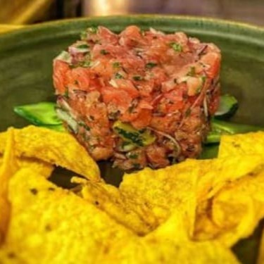 ('Peixe picado e temperado com molho especial e nachos')