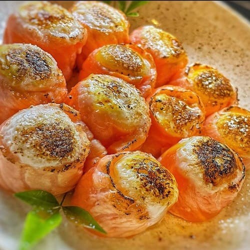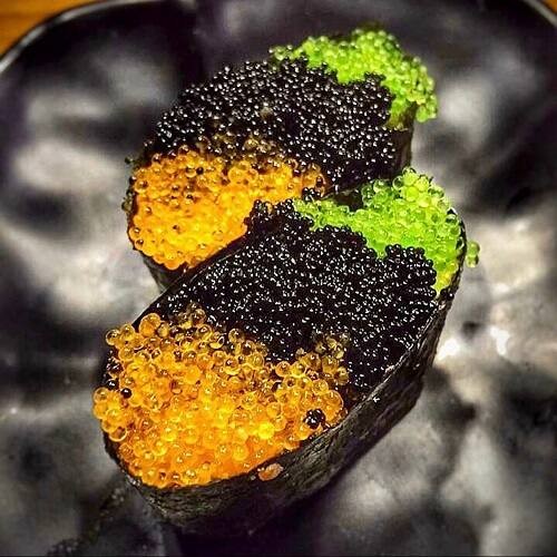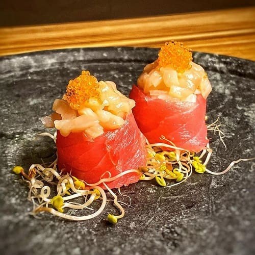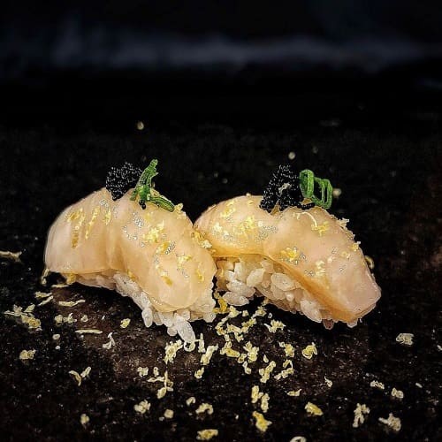 ('Nigiri de vieira, laminas de limão e ovas')