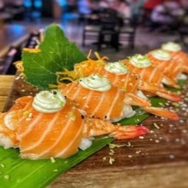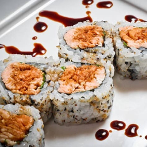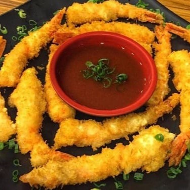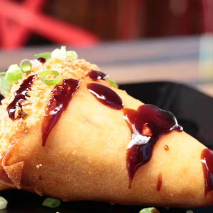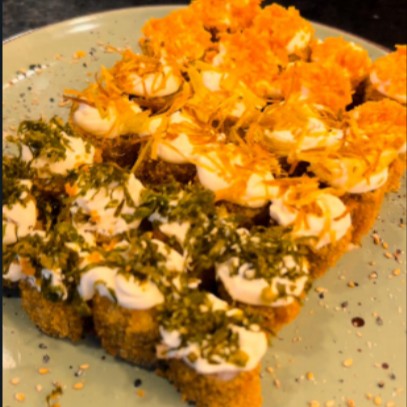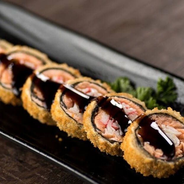 Delicioso rolinho de sushi empanado com recheio de camarão e cream cheese, finalizado com molho picante.