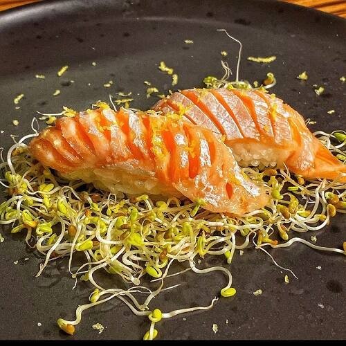 ('nigiri feito barriga do salmao, raspa de limão flor de sal, azeite trufado')