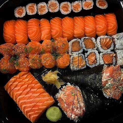 (4 Jyos Salmão com Salmão Grelhado, 4 Jyos Salmão, 6 Futomakis e 6 Sashimis)