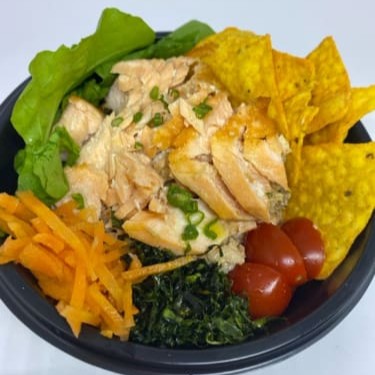 ('arroz, salmão skin cripy, rucula ,cenoura oriental, tomate cereja, cheese, couve crispy, cebola rocha')