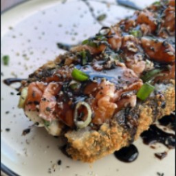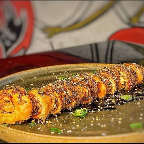 ('Rolê de salmão empanado e frito com molho tare e cream cheese')