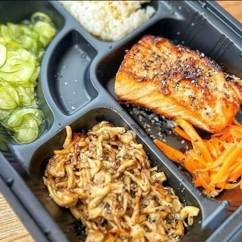 ('arroz, salmao grelhado, rucula ,cenoura oriental, sunomono, cheese, couve crispy, Doritos')