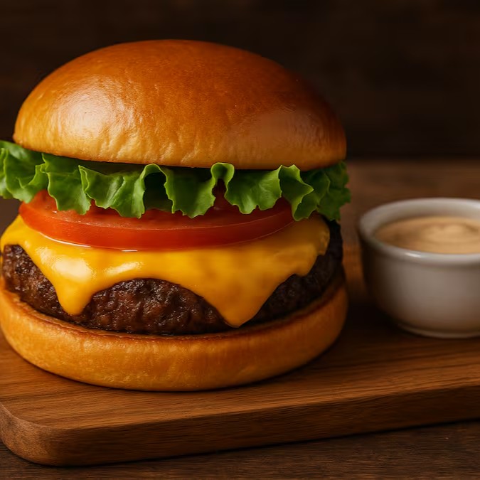 Burger artesanal com 150g de carne bovina, queijo cheddar derretido, pão brioche tostado com manteiga temperada, molho verde da casa, alface e tomate. Sabor irresistível em cada mordida!