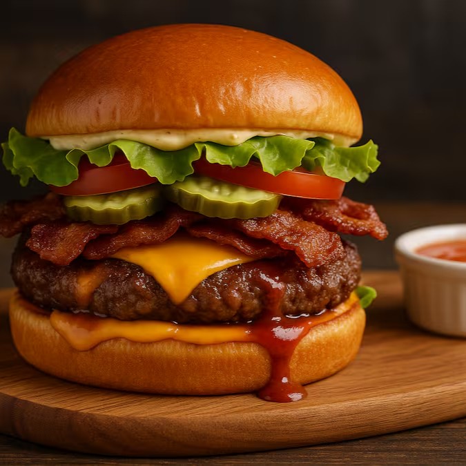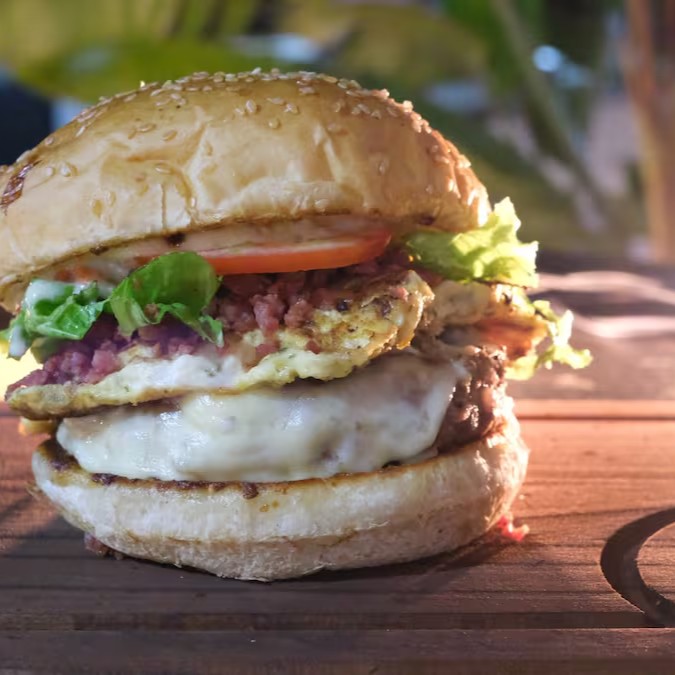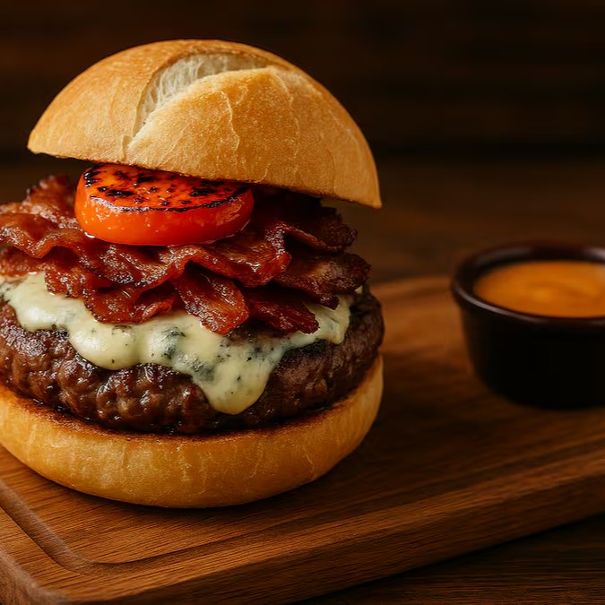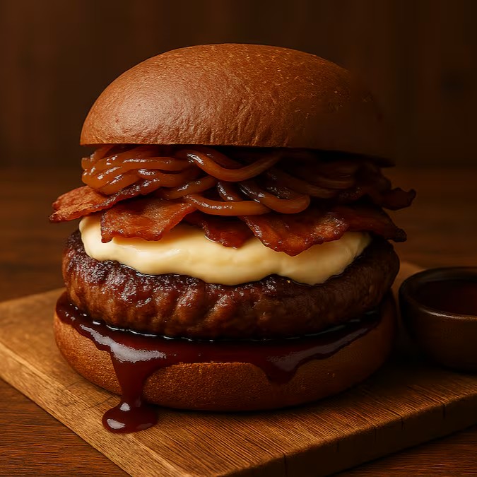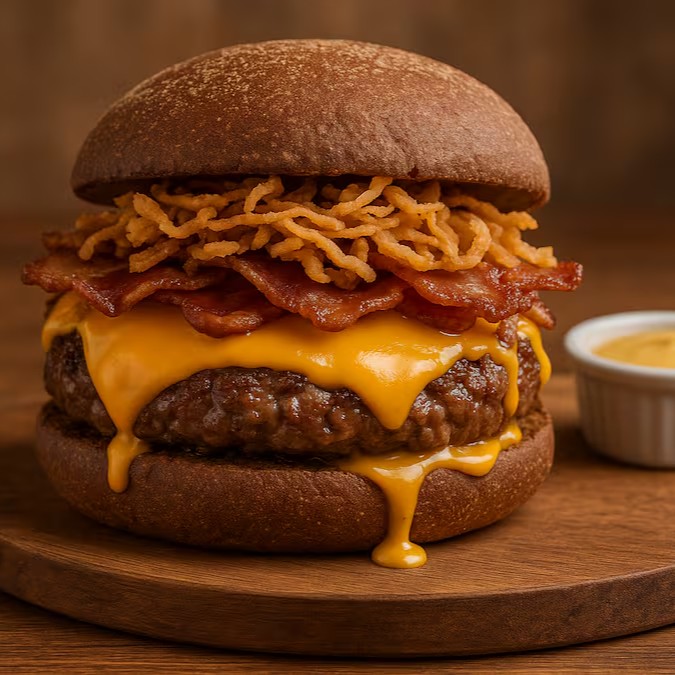 Experimente nosso campeão de vendas! Pão australiano selado na manteiga, blend especial de carnes, queijo cheddar derretido, molho mostarda e mel premium, bacon crocante e cebola crispy. Textura perfeita e sabor inesquecível!