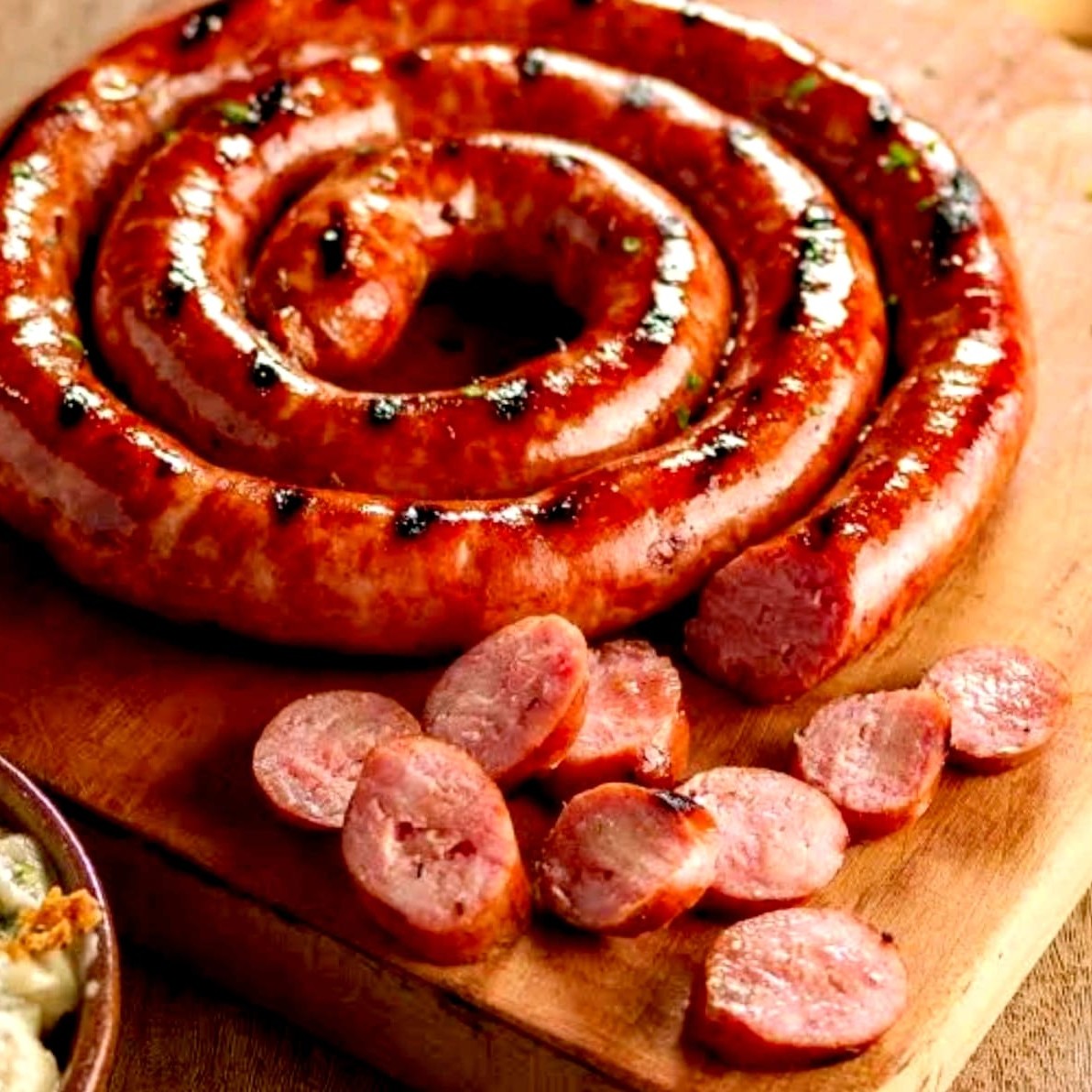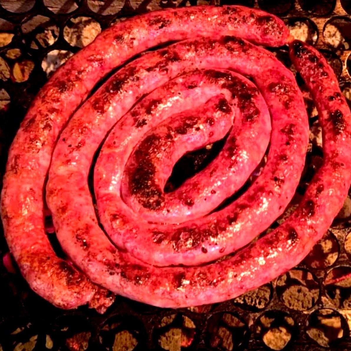 Saborosa linguiça fina em rolo preparada na churrasqueira, onde você escolhe ou vai cortada em porção ou inteira.