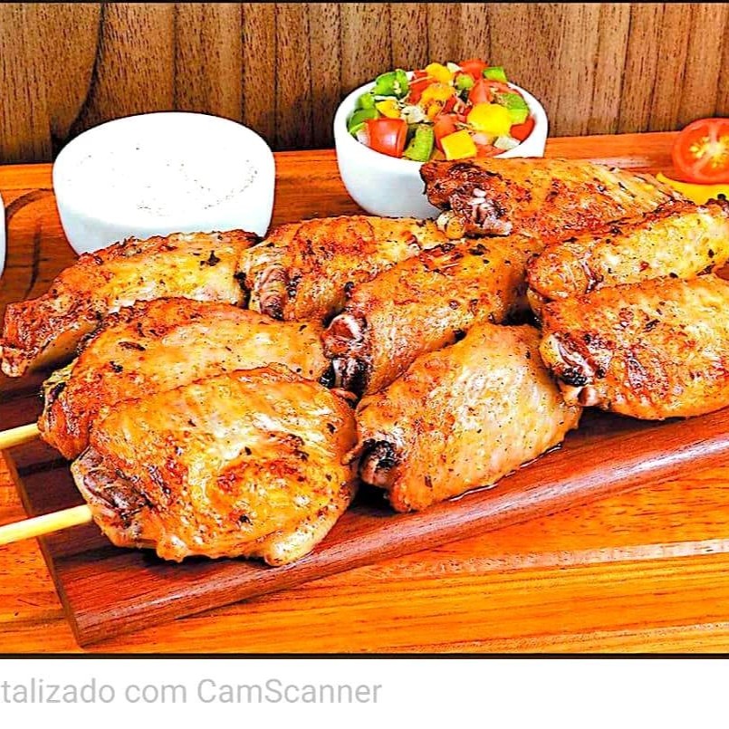 Carne temperada de frango com osso em espeto (meio da asa).