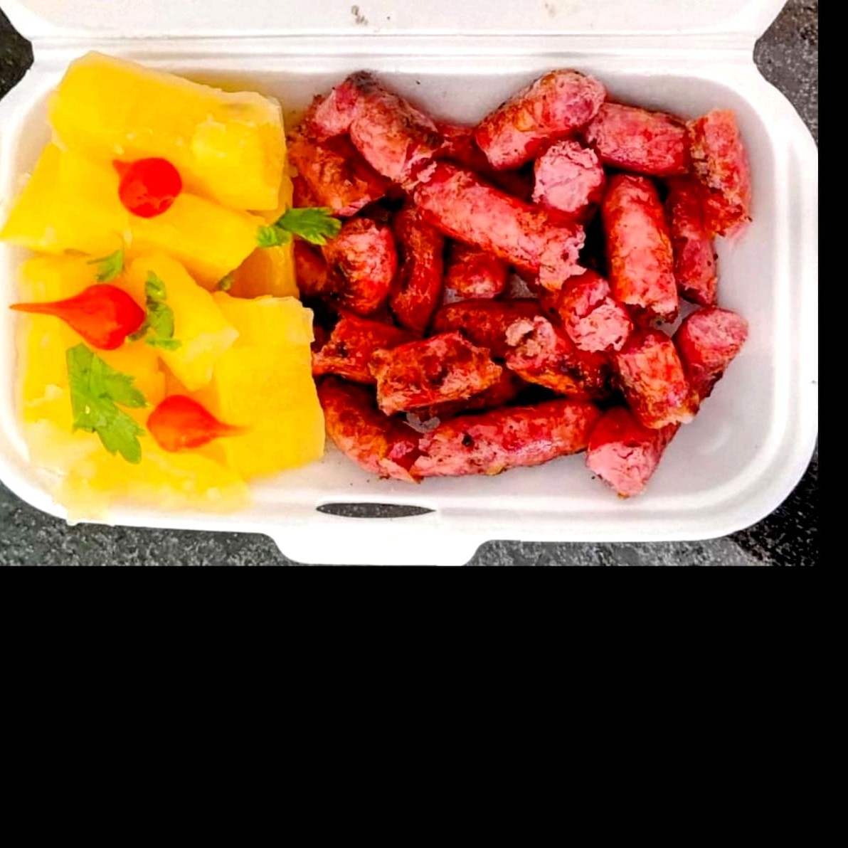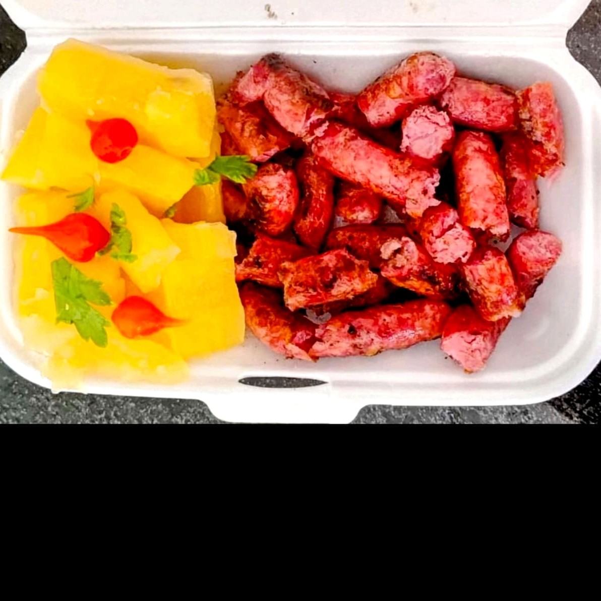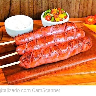 Saborosa linguiça apimentada, preparada na churrasqueira, mantendo assim sabor intenso e acompanhada de uma deliciosa mandioca cozida na manteiga, com aproximadamente 500g, entre linguiça e mandioca.