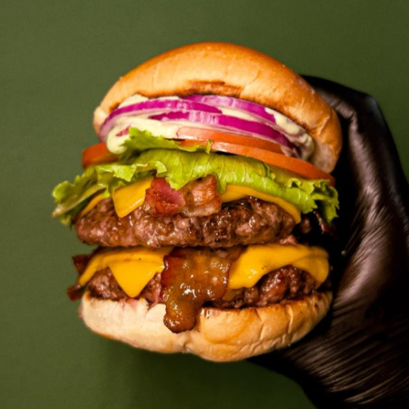 2 hamburguer 160g grelhado na brasa, chedar duplo, bacon duplo. alface americana, tomate, cebola e maionese da casa no pao de brioche