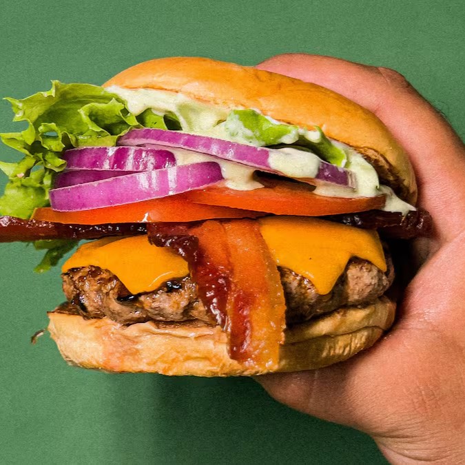2 hamburguer 160g grelhado na brasa, chedar duplo, bacon duplo. alface americana, tomate, cebola e maionese da casa no pao de brioche