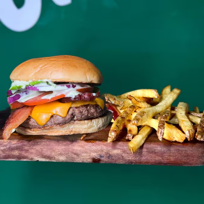 Burger 160g angus, cheddar fatiado ,bacon fatiado. Alface americana, fatias de tomate rodelas de cebola e maionese da casa bem leve ! O básico que conquista qualquer pessoa !