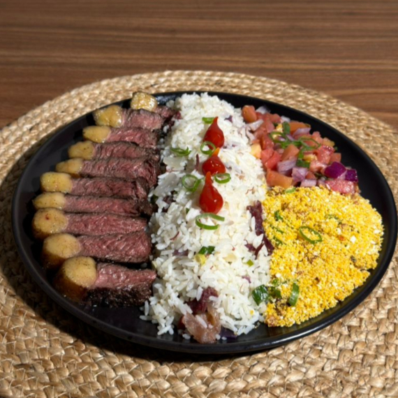Picanha feita na parrilla em torno de 140g a 160 g in-natura, box com 700 ml de arroz carreteiro suave, vinagrete de mandioca sensacional ! Farofa com bacon da casa uma combinação irresistível, serve muito bem 1 pessoa !