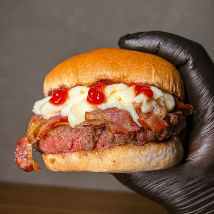 hamburguer 160g grelhado na brasa, cheddar fatiado, catupiry original, bacon fatiado e catchup no pao de brioche