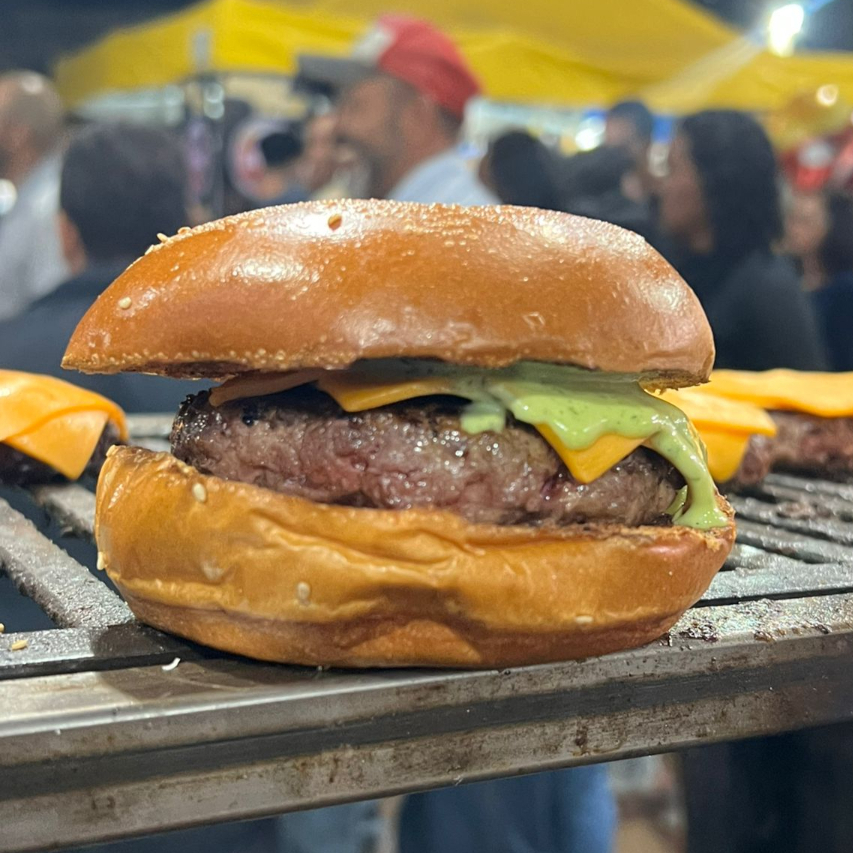hamburguer 120 g artesanal feito na parrilla, cheddar, maionese da casa no pao de brioche