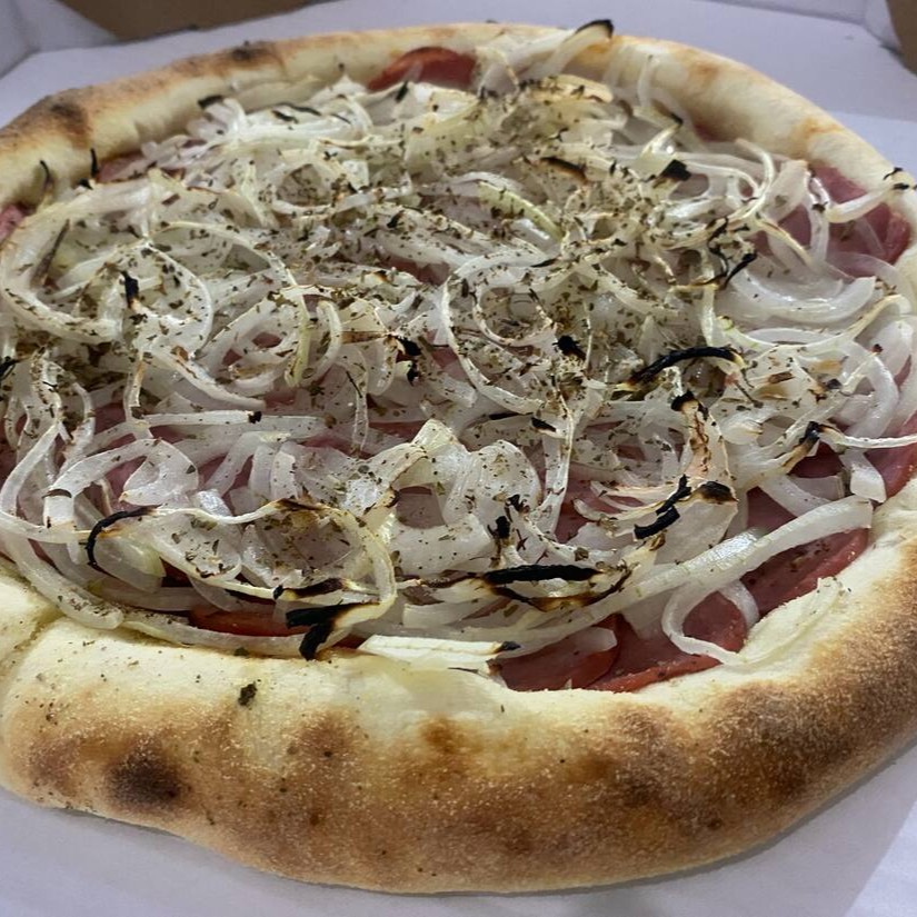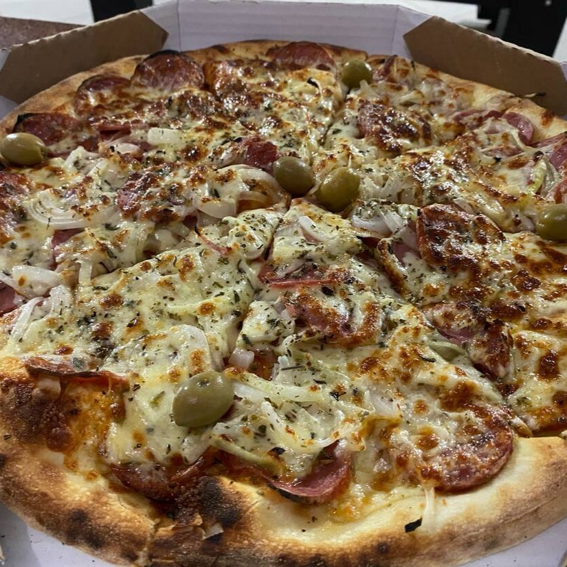 Molho de Tomate artesanal da casa, Calabresa fatiada, Cebola fatiada, Mussarela, Orégano e Azeitonas verdes.