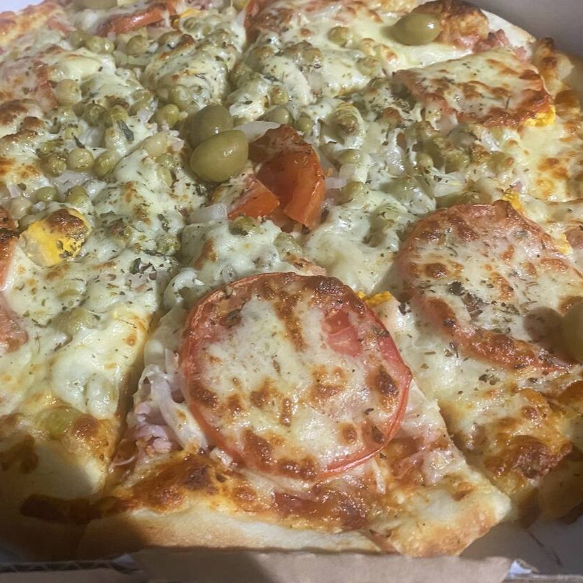 Molho de Tomate artesanal da casa, Mussarela, Presunto ralado, Ovo cozido Ervilha, Cebola branca, Tomate em rodelas, Orégano e Azeitona verde