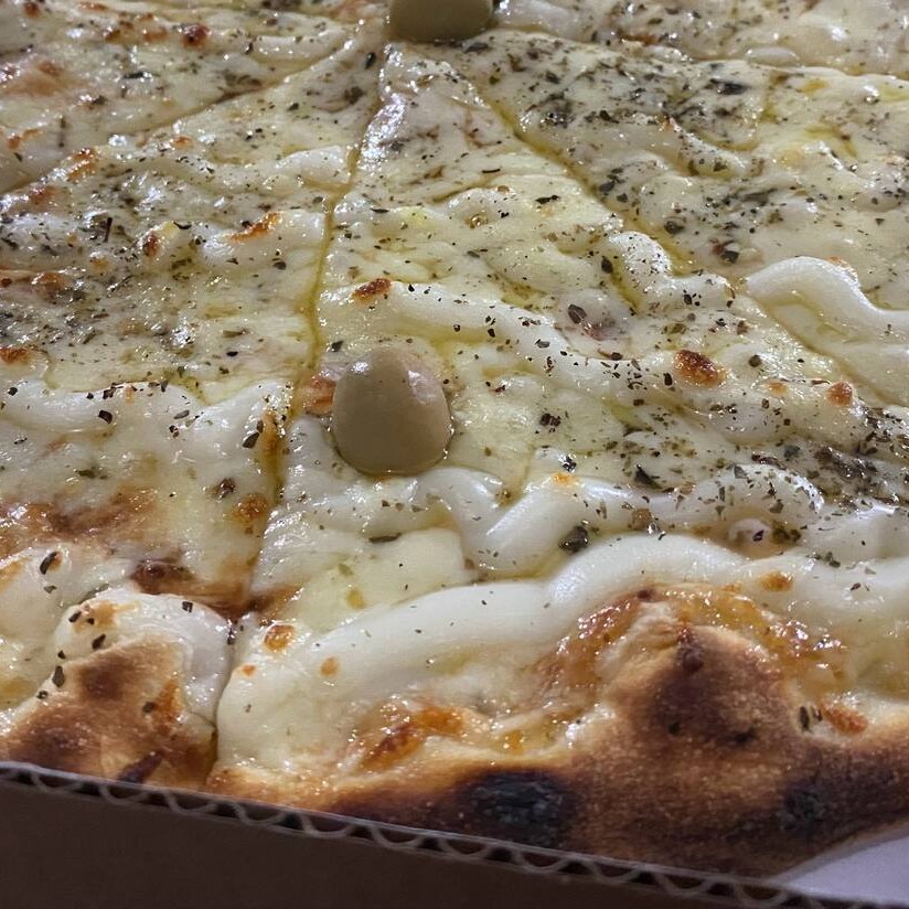 Molho de tomate artesanal da casa, mussarela, orégano e azeitonas verdes