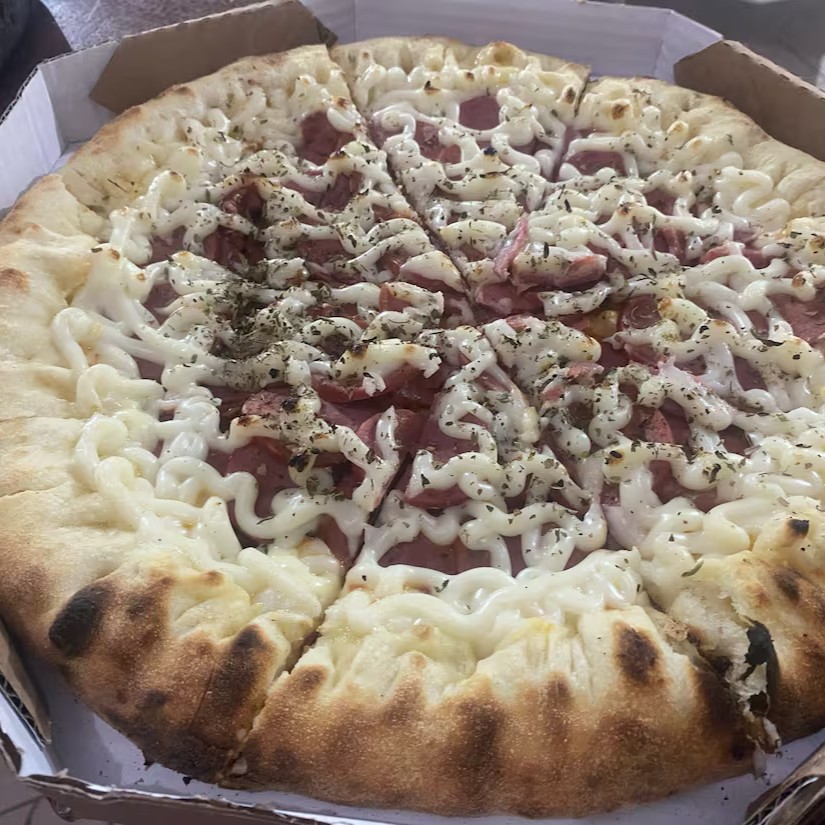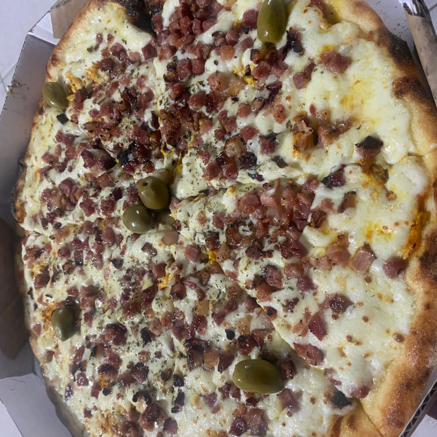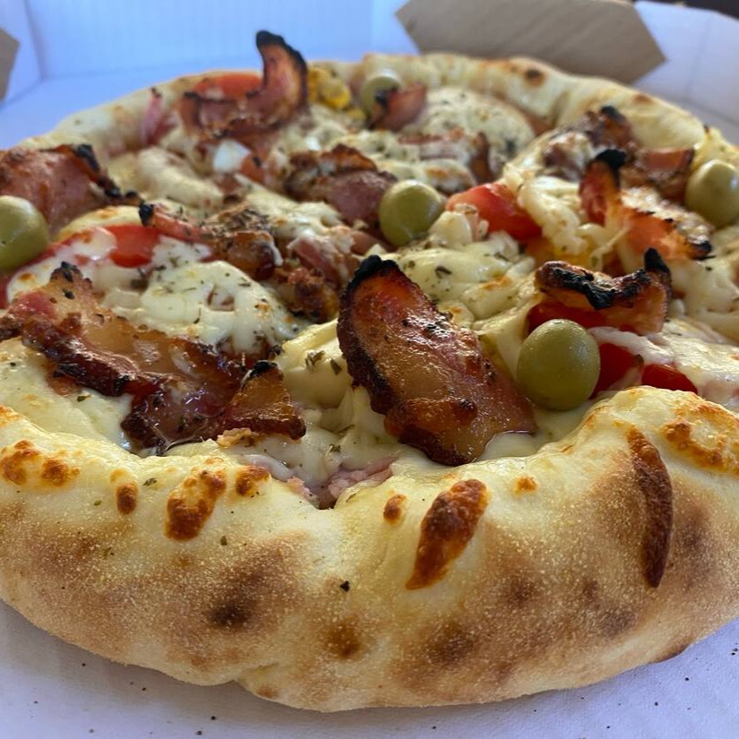 Molho de tomate artesanal da casa, Mussarela, Requeijão, Tomate em rodelas, Bacon frito, Orégano e Azeitonas verdes.