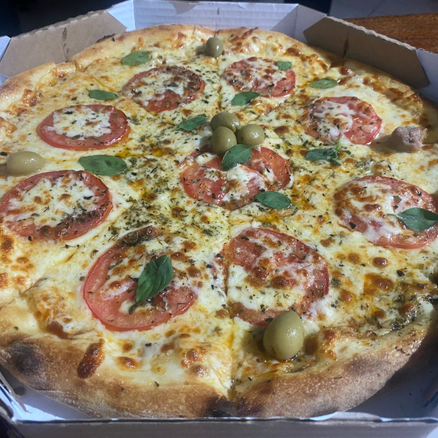 Molho de Tomate Artesanal da casa, Mussarela, Parmesão ralado, Tomate em rodelas, Orégano e Azeitonas Verdes