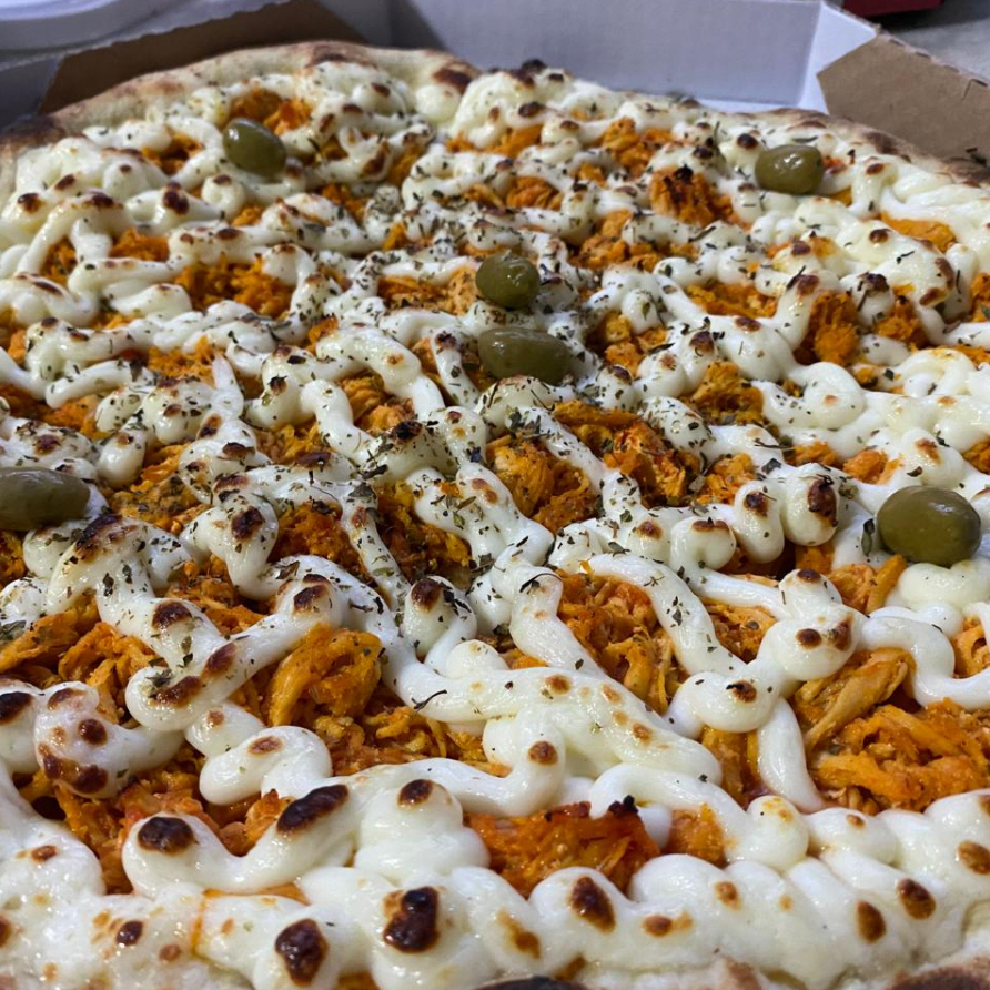 Molho de Tomate Artesanal da casa, Frango desfiado, Temperado, Mussarela, Requeijao Scala, Bacon frito, Oregano e Azeitonas