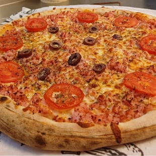 Molho de Tomate artesanal, Presunto ralado, Tomate em rodelas, Mussarela, Orégano e Azeitona Verde