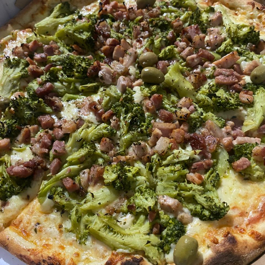 Molho de tomate artesanal da casa, Muusarela, Brócolis temperado, Bacon frito, Orégano e Azeitonas Verdes