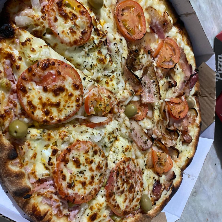 Molho de Tomate artesanal da Casa, Presunto ralado, Ovo cozido, Tomate em rodela, Mussarela, Bacon frito e Azeitona Verde